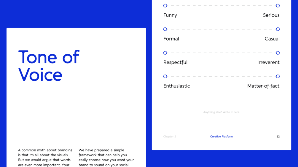 Once finished, you will have a clear idea of why you brand exists beyond making money, and how it should look and sound in the world.
